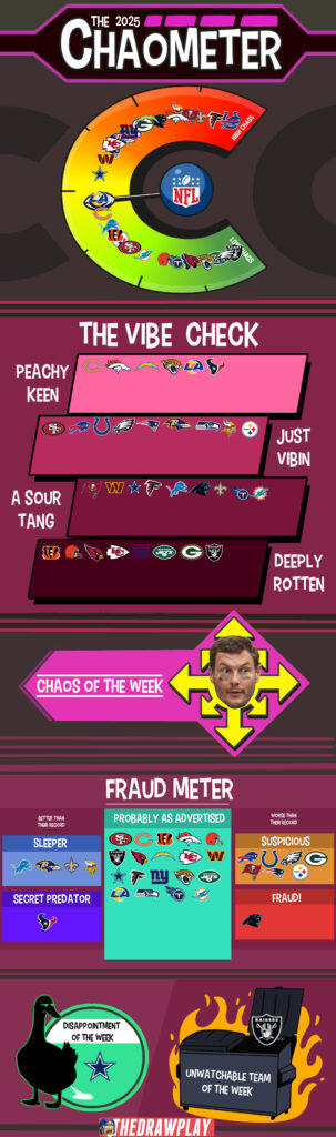 THE WEEK IN CHAOS –THE CHIEFS ARE DEAD. At least for 2025. When the Patriots finally fell I was excited for new blood, and the Chiefs were fun. But they quickly became the very thing they usurped. Seeing the same[…]↓ Read the rest of this entry…