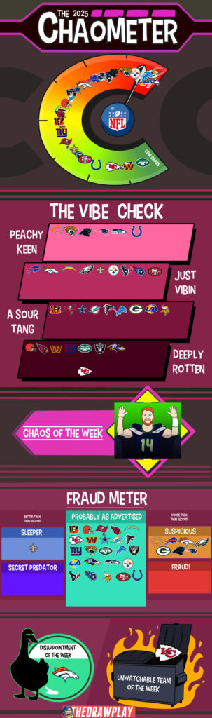 THE WEEK IN CHAOS –That was probably the best chaos we will get all year. 3 games with absolutely bonkers endings, several upsets, maybe only two real clunkers of a game: Eagles @ Commies and Saints/Jets. I hesitate to call[…]↓ Read the rest of this entry…
